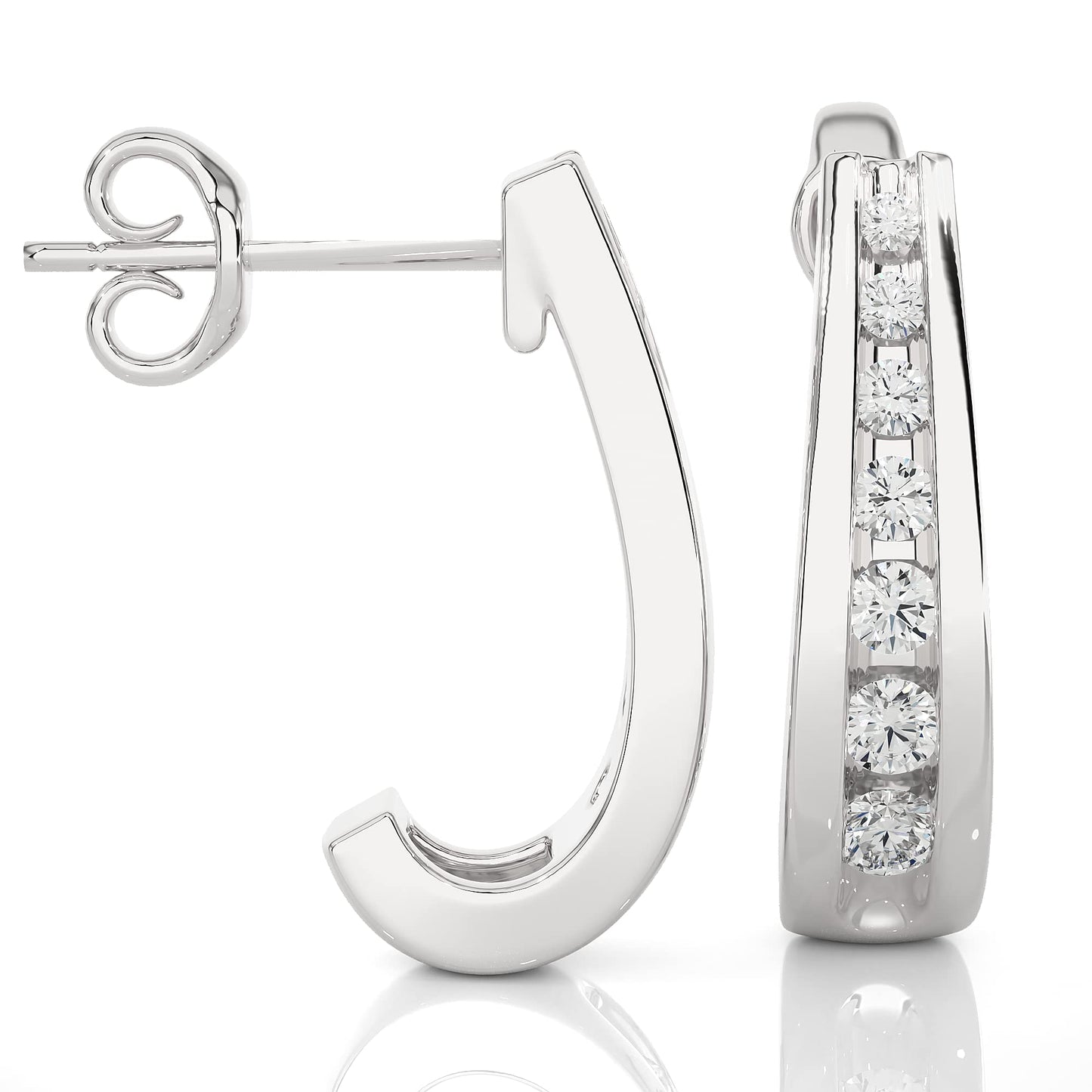 - ELEGANT AND CLASSIC - All components of these earrings were crafted in real, solid, 14k White Gold (rhodium plated - nickel-safe and tarnish free). Each earring features seven brilliant round diamonds of graduating size channel set in a gorgeous J-shaped hoop
