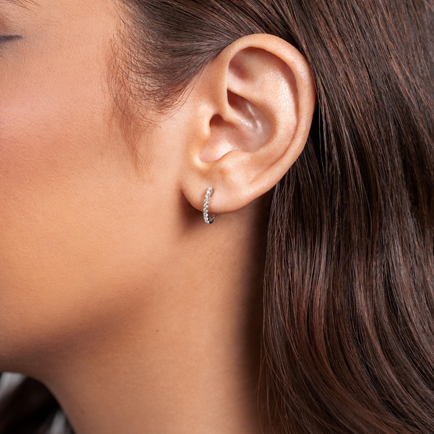 - DESIGN: All components of these earrings were crafted in real, solid, 14K Gold (nickel safe and tarnish free). Each individual earring features nine round brilliant diamonds set in a gorgeous huggy style hoop that sits close to the ear lobe.
