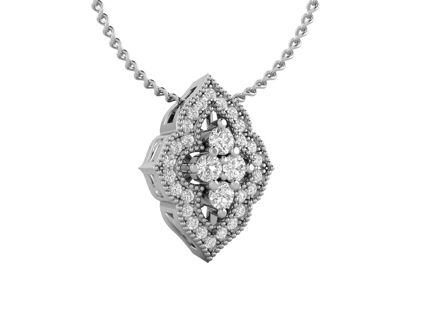 - ELEGANT AND CLASSIC - All components of this pendant were crafted in real, solid, 14k White Gold (rhodium plated - nickel-safe and tarnish free). The pendant features four sparkling round brilliant diamonds nestled in a vintage-looking diamond halo. An 18-inch silver chain also accompanies each pendant